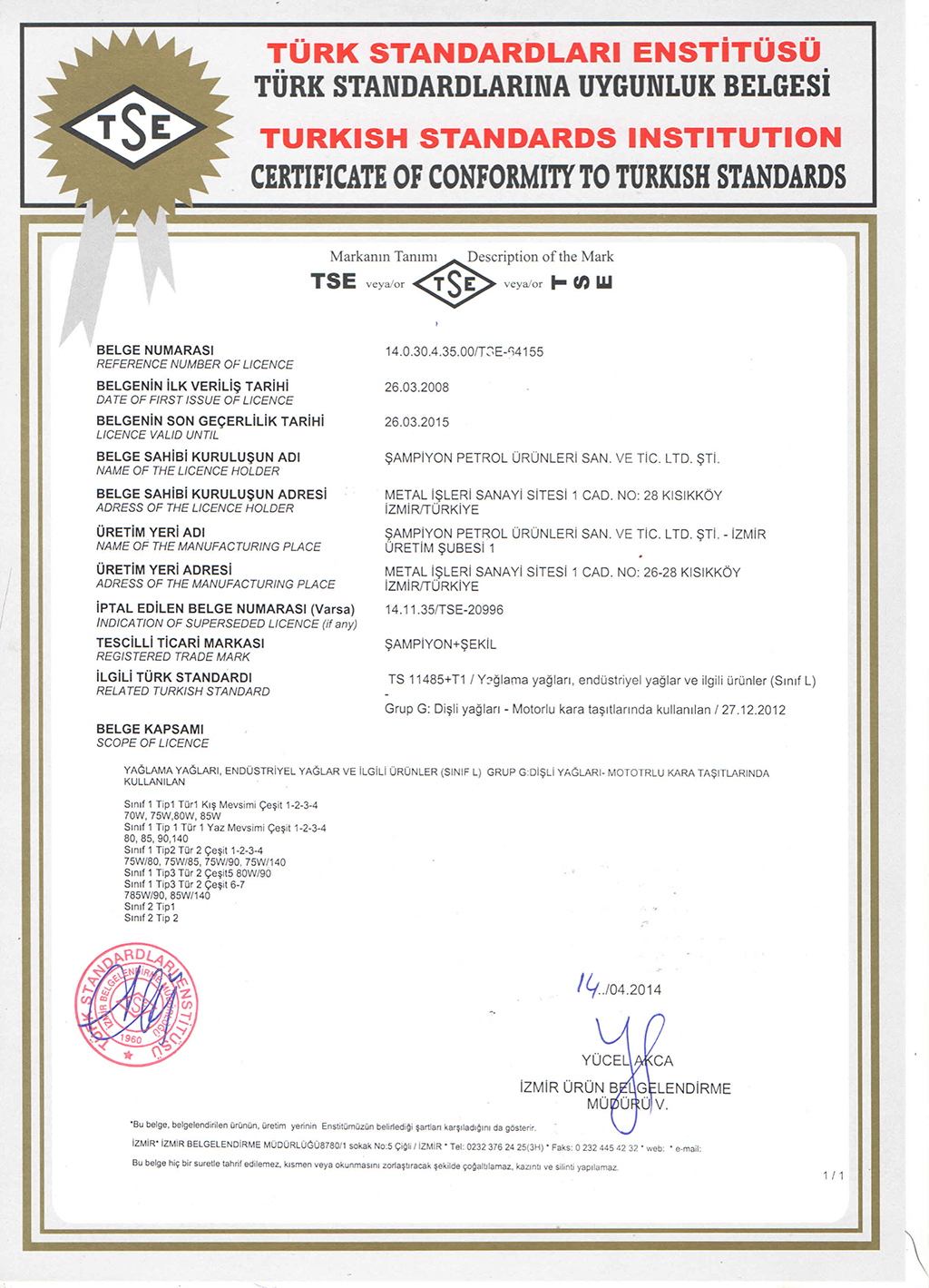 ŞAMPİYON PETROL ÜRÜNL.SAN.TİC.LTD.ŞTİ. ESTİM ORG. SAN. BÖLGESİ 1.CADDE NO.28